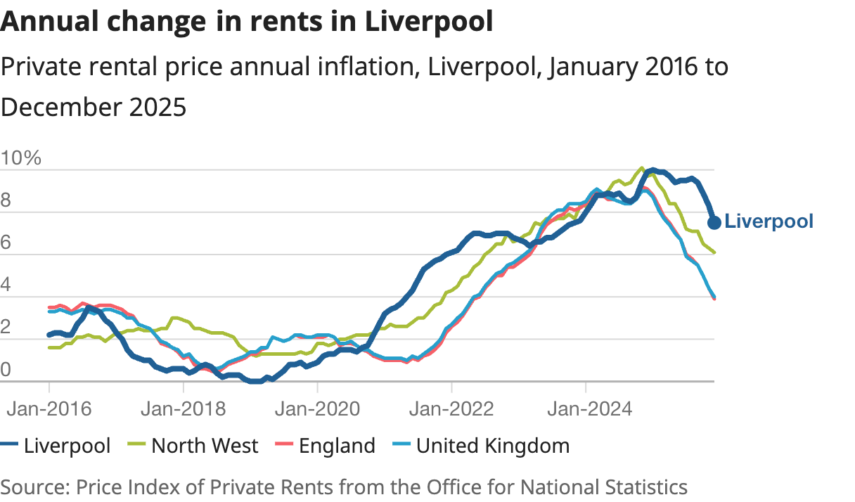 Private rents continue to rise steadily, with ONS reporting an increase of 4% across the UK in the 12 months to December 2025. The average monthly rent is now £1,368. The average rent in Liverpool is now £881 - a 7.5% rise from 12 months ago. As the graph above shows, this growth has decreased since the post-pandemic peak but is still well ahead of the national average.